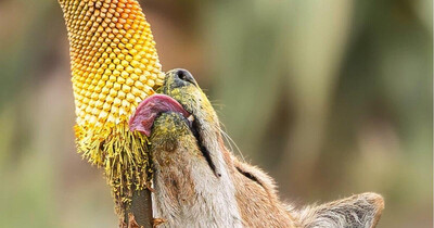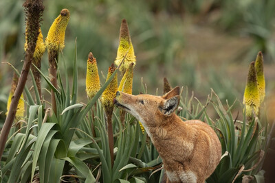 Представьте: эфиопский волк — редчайший и серьёзный хищник — неспешно бродит среди ярко-красных цветов книпхофия и… аккуратно слизывает нектар. Не рвёт лепестки, не грызёт — именно лакомится, переходя от цветка к цветку, словно гурман.